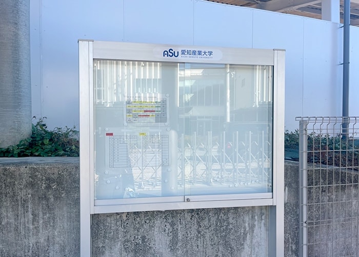 駅バス乗り場にある大学の掲示板です。
