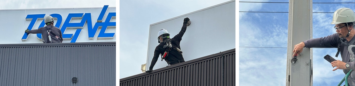 ③ 弊社では点検技士の資格を持ち、的確にアドバイス出来るスタッフが点検をすることにより、看板のメンテナンス、リニューアル等の業務を正しく、安全に行えるようなお手伝いをしています。